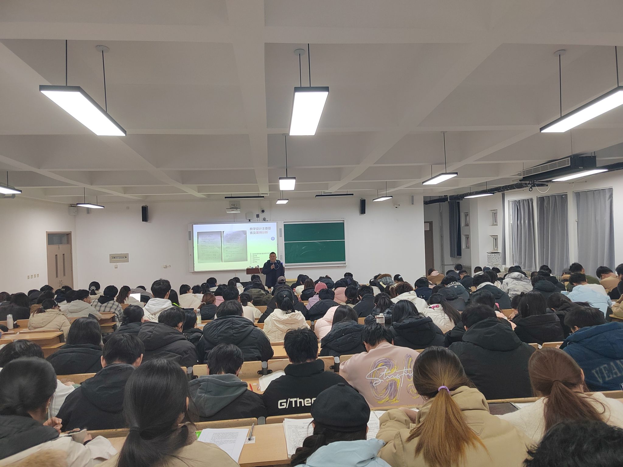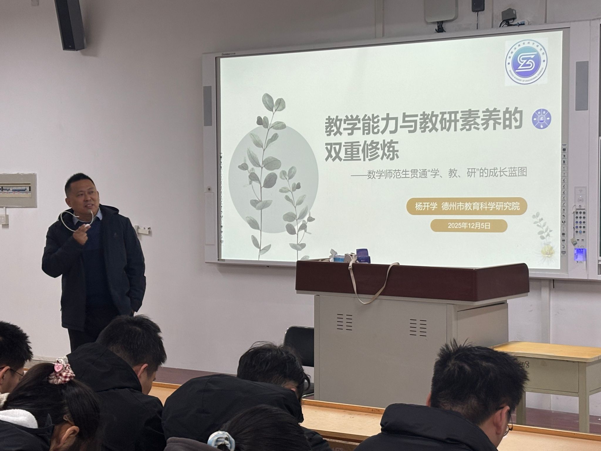 12月5日,数学学院举办初中数学专家报告会,本次报告会邀请到了德州市教育科学研究院初中教研室副主任、初中数学教研员杨开学,做题为《教学能力与教研素养的双重修炼---数学师范生贯通“学、教、研”的成长蓝图》的专题报告,报告会由学院副院长刘春晗主持,2023级、2024级数学与应用数学专业200余名学生参加。
