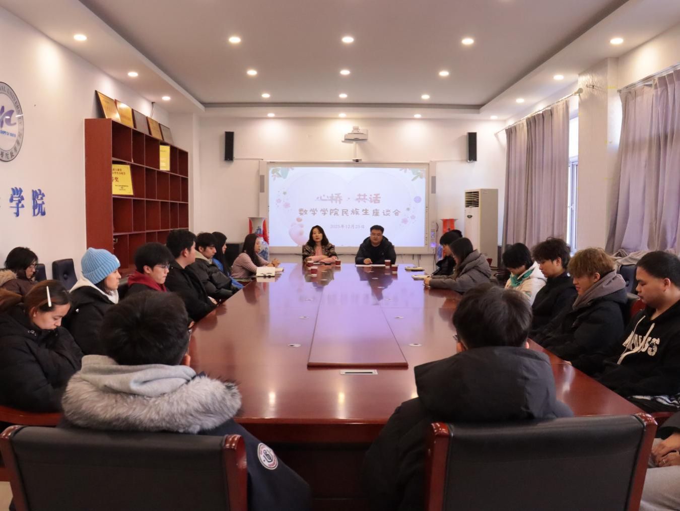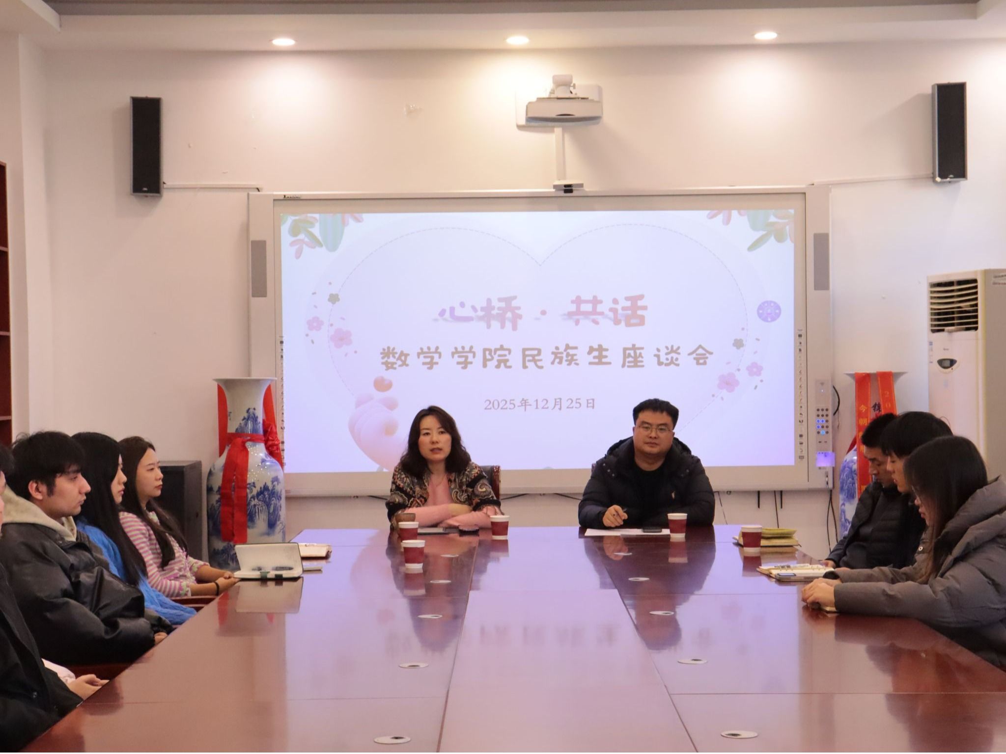 为全面落实立德树人根本任务,深化对少数民族学生的关心关爱与成长支持,促进各民族学生广泛交往、全面交流、深度交融,营造团结互助、积极向上的校园文化氛围,数学学院于12月25日在一号教学楼B306组织召开“心桥·共话”少数民族学生交流座谈会。学院党委副书记李钰茜、团总支书记王亚东、团总支副书记刘婕及辅导员王政文、毛睿雅出席会议,来自9个不同民族的28名学生代表参会,师生双方共话成长发展。